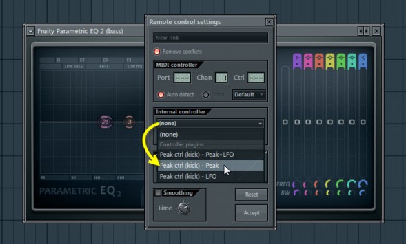 Let’s assume that you want your kick drum to be the sound that will trigger the sidechain effect on your bass sound. In that case – assuming you have assigned kick and bass each to their own Mixer tracks – drop a Fruity Peak Controller to the kick drum’s effect slot and Fruity Parametric EQ 2 (or your favourite EQ plugin) to the bass sound effect slot.