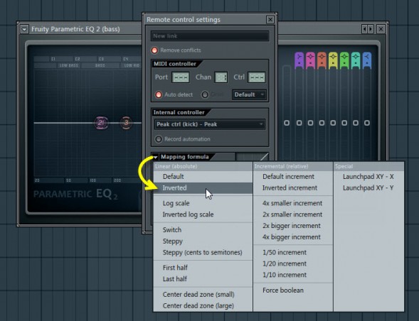 Under the ‘Mapping formula’ select ‘Inverted’. This sets a mapping relationship between the controller and the target control so that the increases in the controller value decreases the target controller – in other words, we’ll get a dip in the PEQ2 low shelf filter frequency volume every time the kick hits.